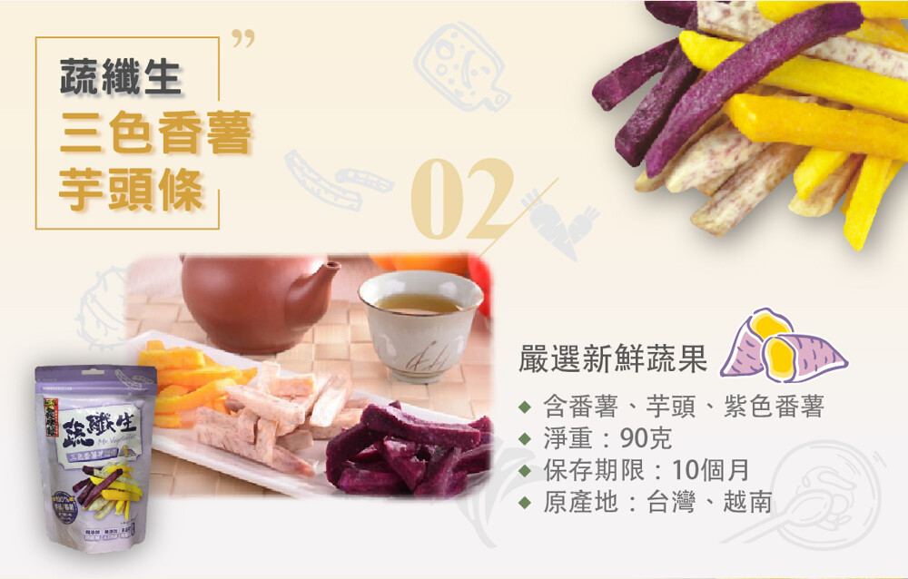 .含有多達七種蔬果:甘藷、紫地瓜、波羅蜜、 紅蘿蔔、敏豆、香蕉、芋頭